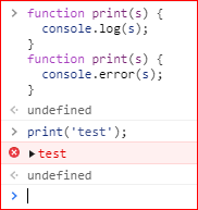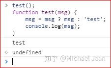 简单说明:上例当中声明了一个名为test的函数,仅接受一个或者零个参数,最终根据参数的不同在控制台生成不同结果的字符串。