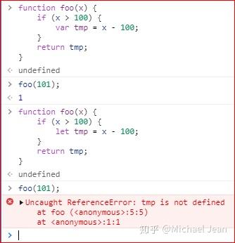 上面代码中,变量x在条件判断区块之中使用var声明,结果就是一个全局变量,可以在区块之外读取;而变量y使用let声明,结果只能在条件判断区块内生效,故此无法在区块外读取。