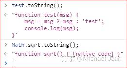 函数的toString方法返回一个字符串,内容是函数的源码;但是对于原生的函数(JavaScript预定义的函数)则会返回function 函数名 (){[native code]} :