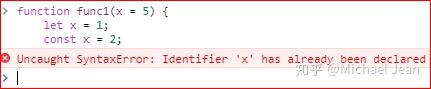 参数x = x形成一个单独作用域。实际执行的是let x = x,由于暂时性死区的原因,执行时会报错:变量x未初始化/未定义。