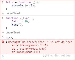 上面代码将函数x作为参数,传入函数y。但是,函数x是在函数y体外声明的,作用域绑定外层,因此找不到函数y的内部变量i,导致报错。