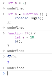 上面代码中,函数b是在函数f7的外部声明的,所以它的作用域绑定外层,内部变量a不会到函数f7体内取值,所以输出2,而不是10。