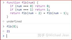上面代码中,fib函数内部又调用了fib,计算得到斐波那契数列的第8个元素是21。